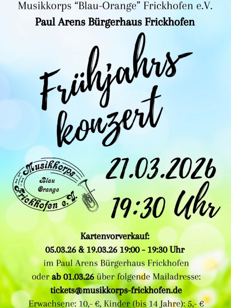 Liebe Mitglieder, unsere diesjährige Generalversammlung findet am Samstag, den 15.03.2025 um 19:30 Uhr im kleinen Saal des Paul-Arens-Bürgerhauses in Frickhofen (Marktstraße 2) statt. Hierzu lädt der Vorstand Euch / Sie herzlich ein. Nachstehend geben wir Euch / Ihnen die Tagesordnung bekannt: